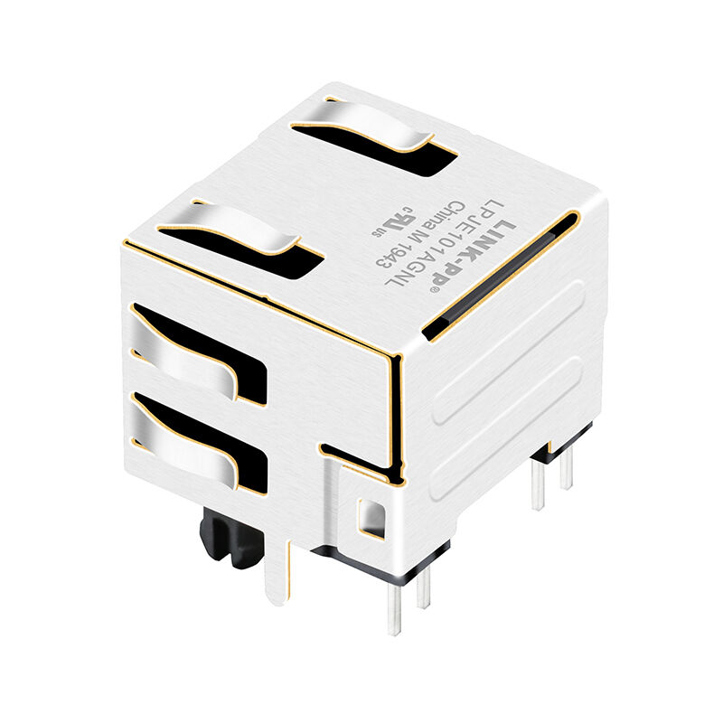 Đầu nối này có thiết kế lỗ xuyên (ngang) góc phải, vỏ che chắn EMI tích hợp với các ngón tay bảng điều khiển, và đèn LED kép để hiển thị trạng thái liên kết và hoạt động của mạng.