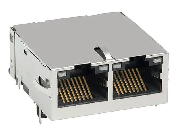 0826-1X2T-23-F Gigabit MagJack cổng kép RJ45 kết nối với từ tính tích hợp, 12 lõi, màn chắn EMI, cách ly 1500Vrms và chỉ số LED cho thiết bị mạng 10/100/1000Base-T Ethernet.